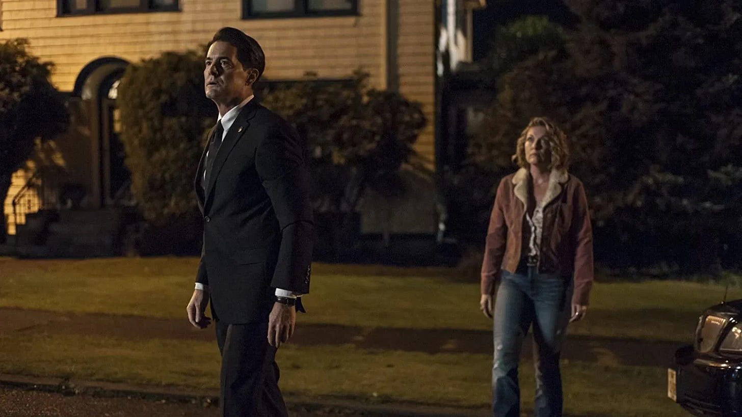 And the world is fleshed out now more than ever. But this wouldn't exactly be a full fan service treatment. Things have changed; time has moved on. Long-time favorite characters have grown or evolved, or passed. One of the biggest changes occurs with our main character following the events of the first season. Kyle MacLachlan returns in multiple roles, most prominently as the nefariously sinister Mr. C, a cold and sadistic version of the good agent Cooper, who's avoiding his tether to the Black Lodge. The other is Dougie Jones, a no-good insurance salesman possessed by all the decent and good parts of Cooper, not fully our White Knight, but with discernible shades of his former self. And there are small glimpses at our actual Cooper, stuck in the Lodge looking for an escape. It’s an incredibly dense role with a ton of stuff for MacLachlan to do, but proved to be a bit unpopular.